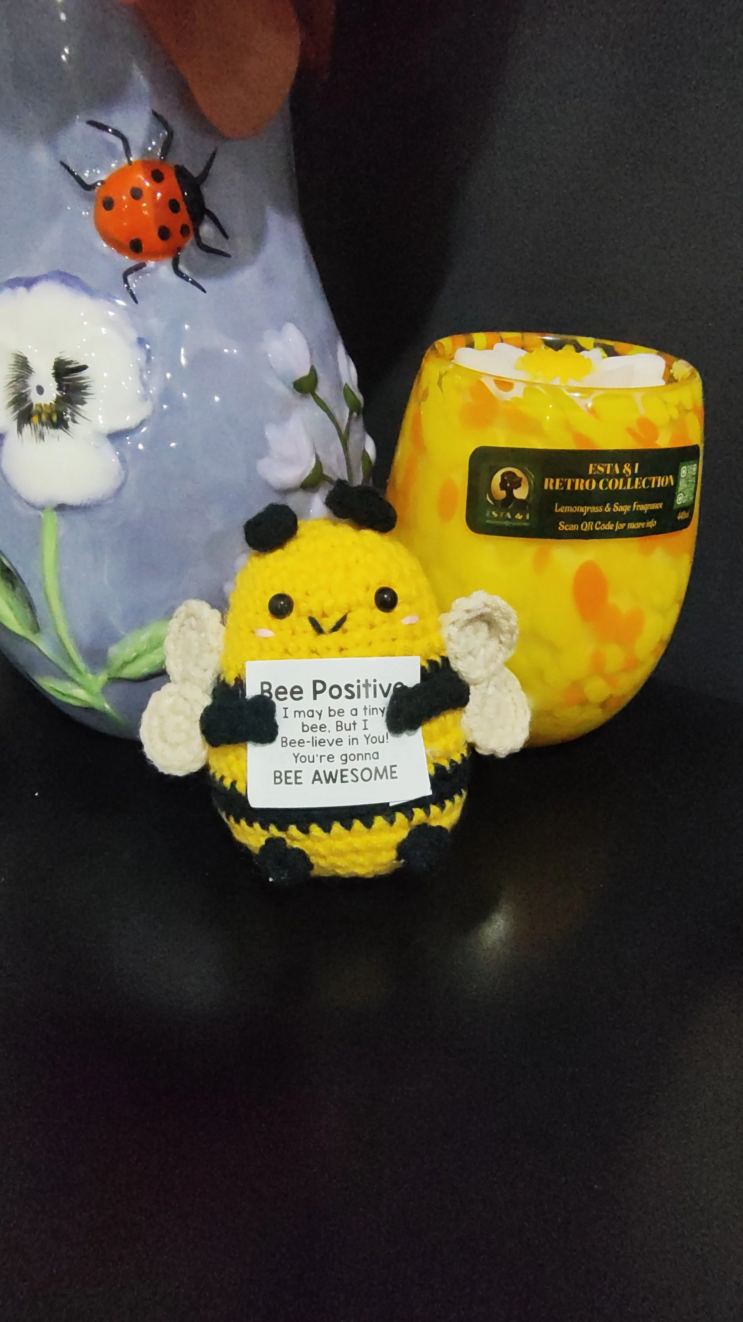 A tiny crochet bumble bee to remind yourself or a loved one, to stay positive.